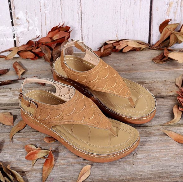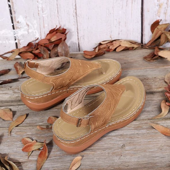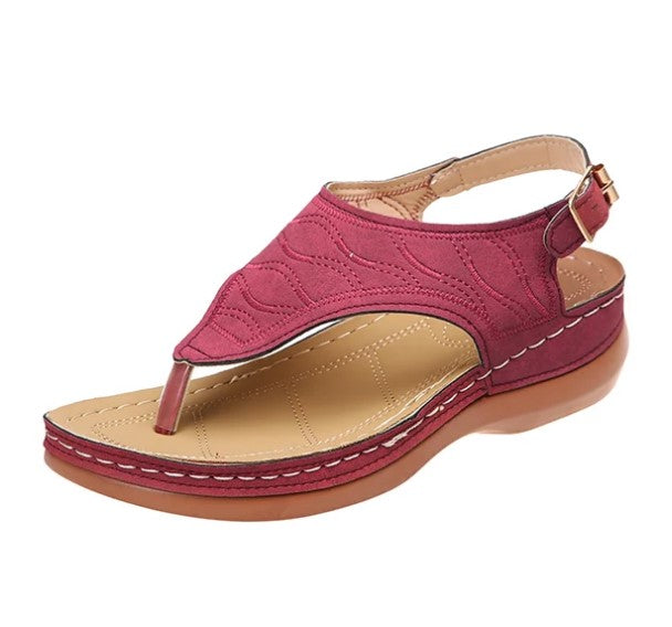 Simply, slip them on and snug your feet in place around the toe clasp for enhanced support.